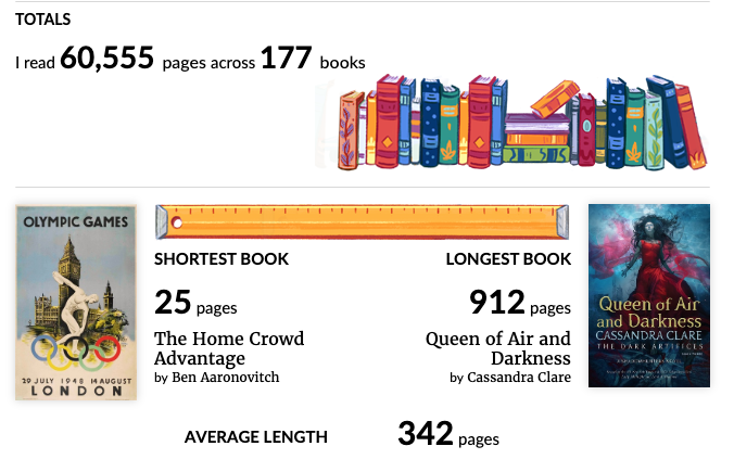 For some reason it shows that I only read 177 books. I know I am missing a few, because I didn’t record some of my re-reads, but my last two books are not showing up on the list. Anyways, according to my calculations I actually read 186 books this year. Hmm, I seem to recall that I was trying to read less this year, but I actually read five more books than last year. Of course I was choosing shorter books this year as well, so I guess that plays into the total as well.