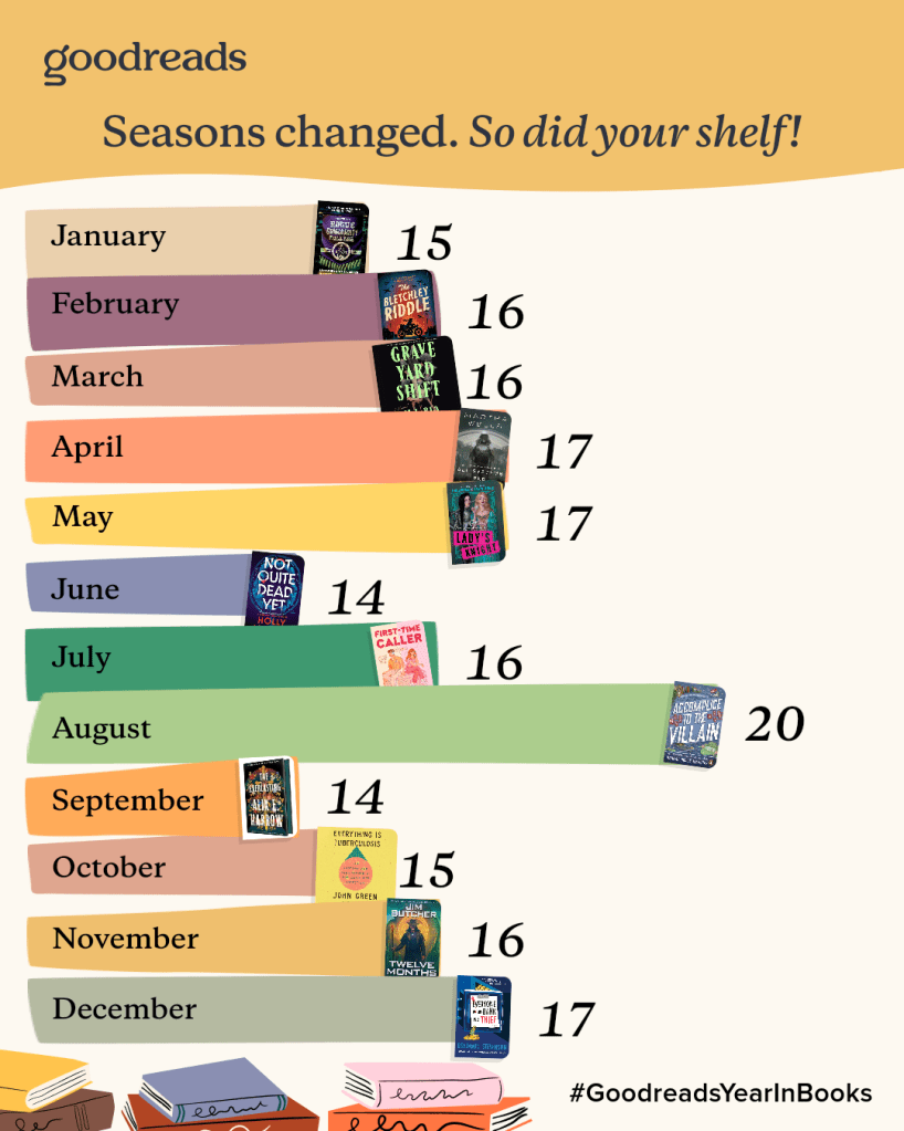 Here is another cool graphic from Goodreads that shows my reading for each month.