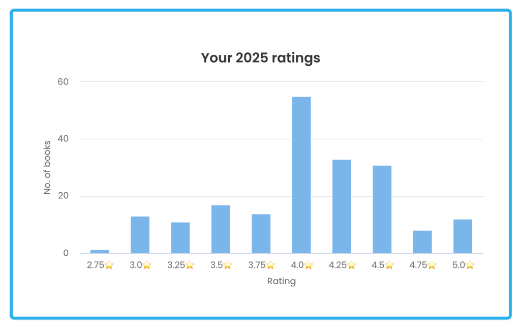 This graphic is from Storygraph. I like that I can rate a book more accurately there than on Goodreads. My average rating was 4.04, and only 12 books were 5 stars.