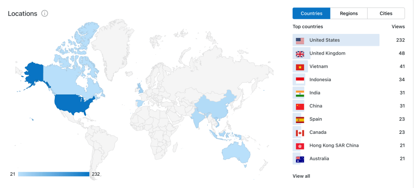 My favorite stat to look at is the locations of all my visitors. I don’t put a lot of stock into the China and India stats as many of those are probably bots, but I do enjoy seeing other countries on the list.