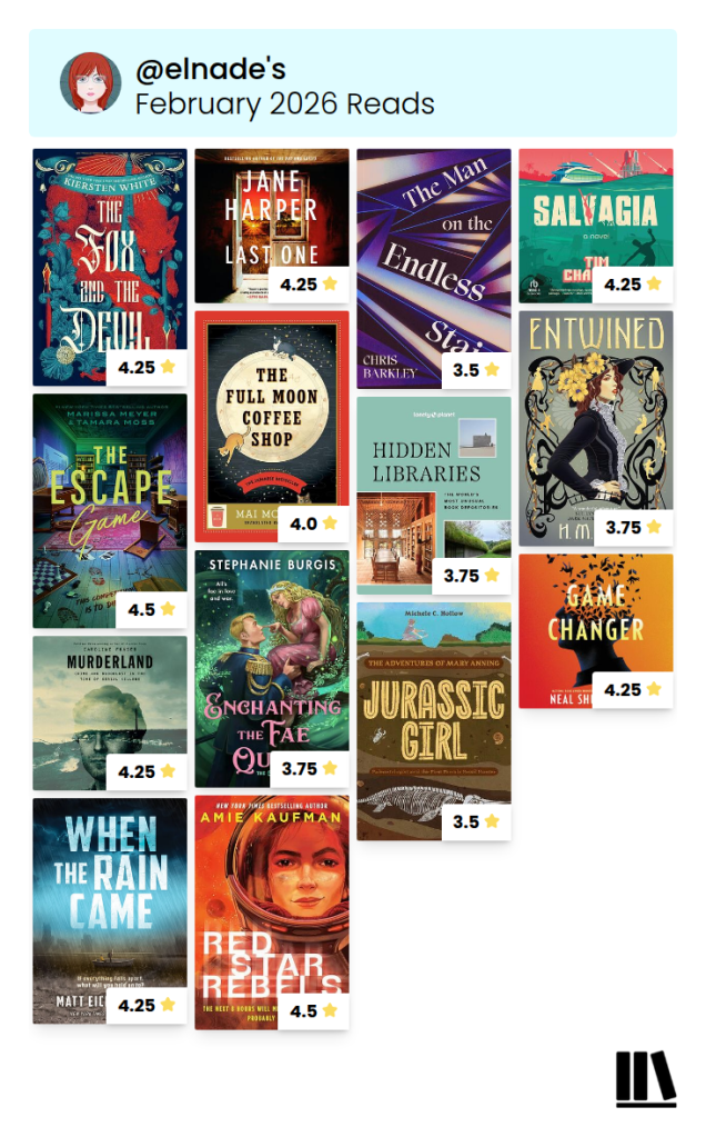 Even though February is the shortest month, it felt like it lasted forever to me. Such a long month, but still a good reading month. Though I didn’t get all that much read. Especially my physical books. Those really seemed to take forever to read, even when they were good. I finished 14 books this month and none of them less than 3.25 stars and many of them were above 4! I even managed to read two very different nonfiction books. Lots of books to talk about, but first check out the graphic showing all of the books with their ratings.